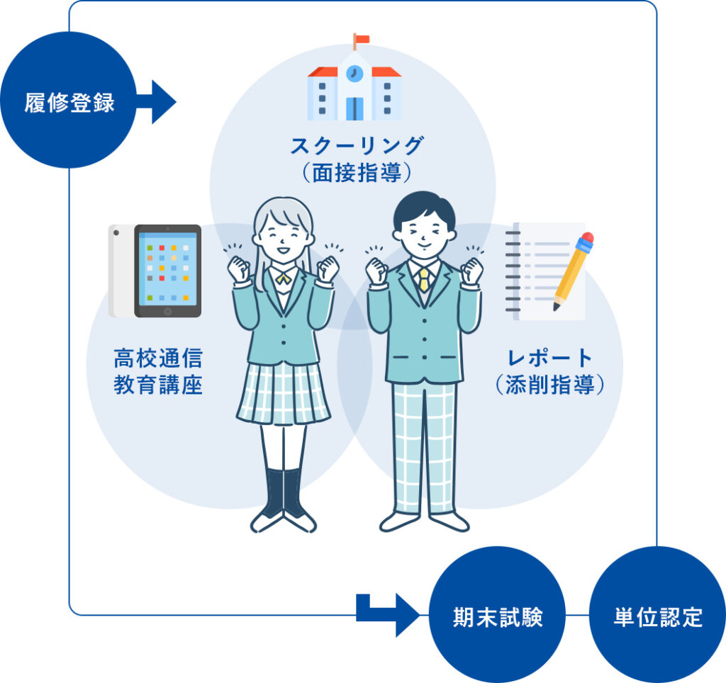 提出したレポートに本校の教員が丁寧に添削・評価をして返却します。その際、不十分なものには再提出が課されます。再提出を課されたレポートが合格しないとその科目の単位は認定されません。この繰り返しが添削指導です。レポート作成に取り組むことは、書く力・まとめる力を育成するので、入試の小論文対策にもなります。